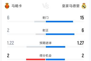 体育资讯4月5日讯 西甲第30轮马略卡2-1皇家马德里,以下为双方全场数据对比:
