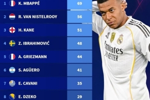 德转列从未夺冠的欧冠射手榜:姆巴佩69球、范尼56球、凯恩51球