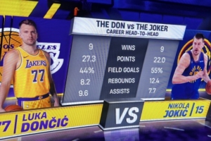 赛前转播方对比了湖人球星东契奇和掘金球星约基奇交手时的数据,具体如下: